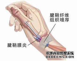 4、在桡骨茎突处有疼痛、压痛和局部性肿胀,有时可触及硬块。